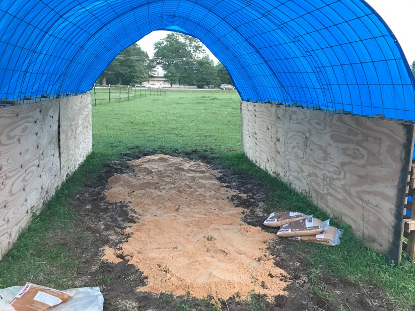 Instead we settled for some sand. We bought 30 bags and covered the ground to help with drainage and hopefully keep there hooves and legs out of the worst of it. Poor Dusty hauled those bags and dumped them for me. This was halfway through.