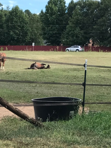 Things were going so well that I decided to canter. Cantering isn’t our strong suit, so I made a plan. I’d have her trot coming back towards home, and incidentally Pete who decided to graze in the middle of our work area, turn to corner to go back away and ask her to canter in the corner but not keep her on the circle as that tends to just make the canter fall apart. I started to the right for no reason other than we were already gong that way and she picked up the canter no issues. She seemed really happy to be cantering and I let her make multiple large loops around the pasture. She is no different in the canter than the trot in so much as she likes to slowly continue to speed up. If I am not careful she will begin to gallop around having the time of her life. The one down side to my method of keeping her feet moving in different ways is that it is really hard to do that in the canter when you have no idea how to do a flying change and don’t want to just end up counter cantering half the time, but I made sure to circle, go straight and make large and small loops.