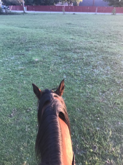 The only issue now was that she wanted to canter. The trot became a bit of a mess with tension and a lot of asking to canter whenever my leg touched her and all I wanted was a trot. Eventually she settled and I let her canter the other direction for as long as she was polite about it and then began the process of getting her to trot again. her trot work is always a bit of a mess after a nice canter. She gets fast and braced and decides that all the slow trotting is not worth her time, but I did my best to not get pulled into the fight. Once she trotted nicely without breaking to a canter for a single large lap around the end of the pasture, I called it a night.