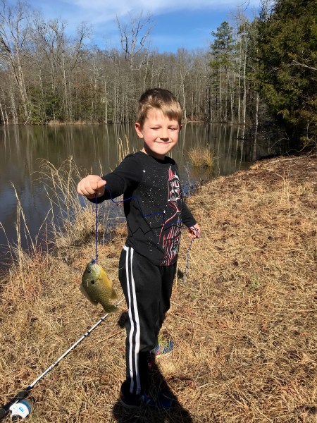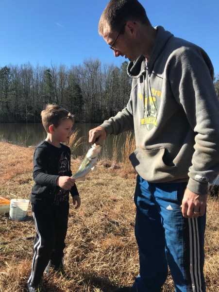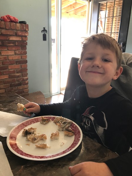 And then scarfed down not only his bass and blue gill fillet, but then Dusty’s blue gill fillet as well. He was so proud that he caught his own lunch. I tried them both and thought the blue gill was pretty tasty, but did not enjoy the bass.