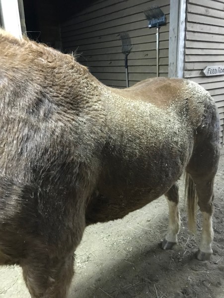 Old Man Winter coming out of his freshly cleaned stall covered in savings from rolling.