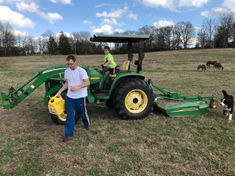 A few Saturdays back I got Dusty to show me how to use it and got busy mowing the large pasture. The new spring growth was being choked out by old, dead bermuda grass that the sellers never mowed and I was worried it wouldn’t grow in very well if not cut back. Plus there were a lot of tall grasses and weeds that needed cut back as well. The weather was gorgeous and Dusty and Wyatt were busy fishing at the pond, so there wasn’t a better time for it.