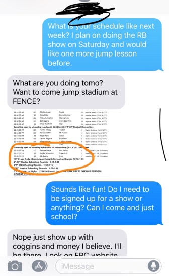 We walked the course and it was interesting. Jumps 1 and 2 aren’t drawn right. Move 2 to the right so that it’s left standard is touching the right one of jump 1. It was a super tight turn. The take home from the course walk was to use the space to my advantage and hug the rail anywhere possible. Trainer pointed out two problem areas for other riders: horses were looking at 6 going from 1-2 and then being caught off guard by the sharp turn and then coming from 5-6 they were losing steam and a lot were breaking to trot through that turn. Going in I thought jumps 1-2-3 would be the hardest for us.