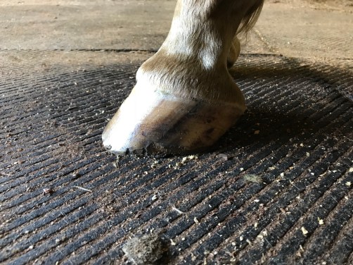 The hoof keeps breaking as the old nail holes grow down and I am hoping once that all goes away the wall will be stronger. He has almost no wall to walk on and while the angle of the hoof will take a year to grow fully out, he should get a stronger support base a lot quicker.