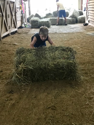 Wyatt helped by rolling bales down the aisle which was no small feat for a 57 lb kid to do with 100 lb bales.