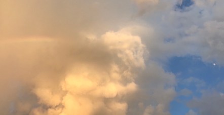 Rainbow to the left, blue sky and the moon to the right. It was an almost eery night with wicked nasty storms.
