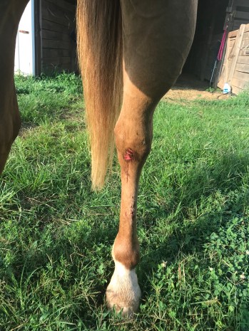 Bad news is that it’s over a joint and healing that could either be easy or a royal pain due to the motion of the skin. For now I put him back out instead of in his stall mostly for my own sanity plus the above no heat, swelling or pain thing.