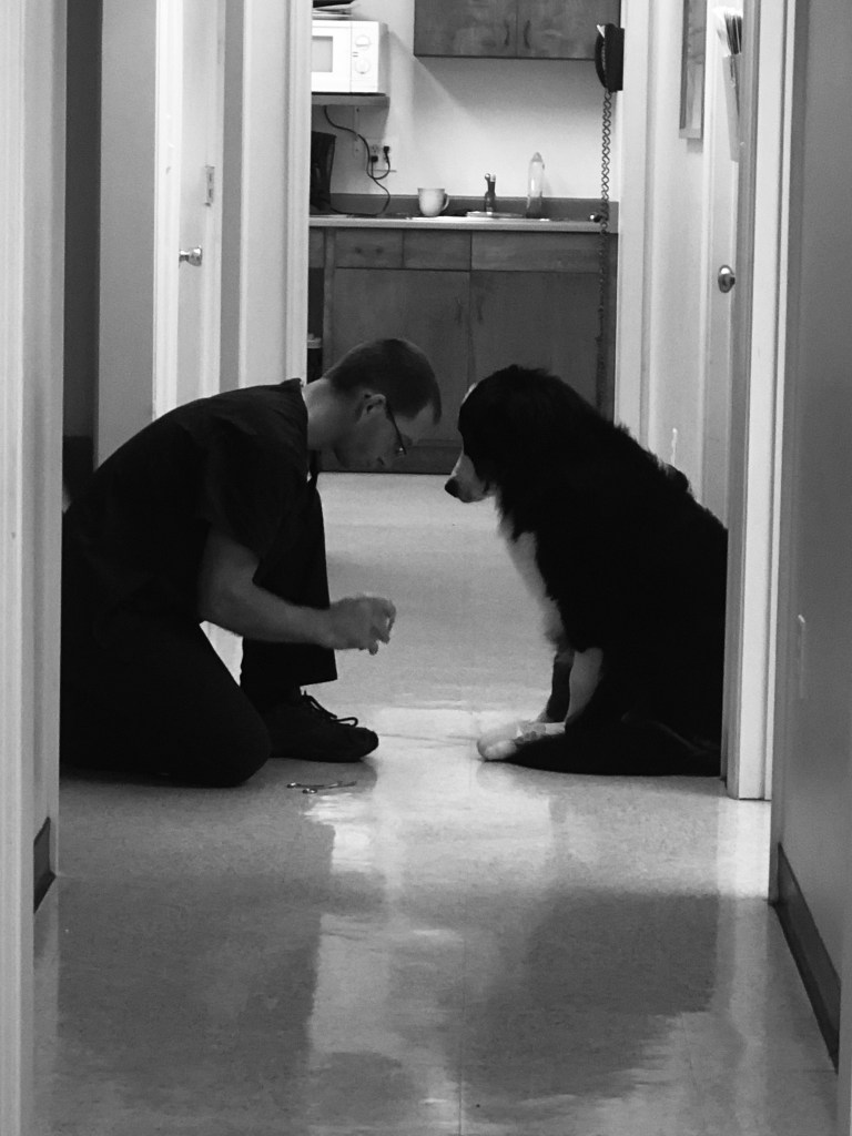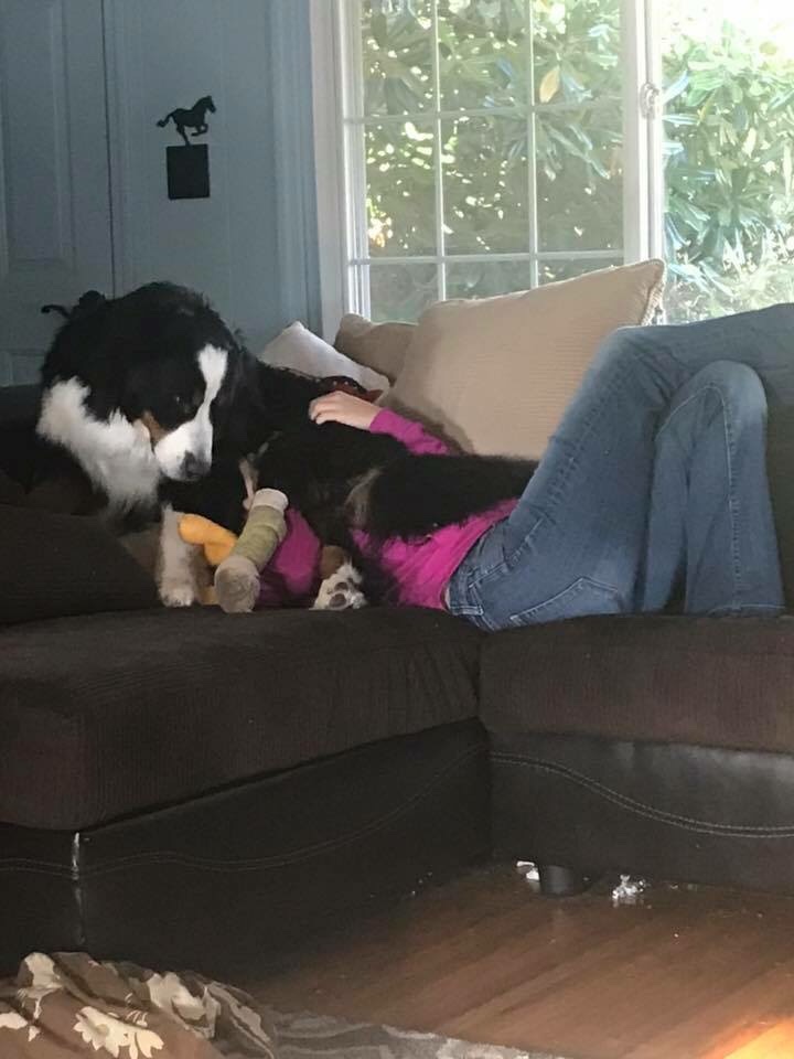 We knew immediately that she had broken her back left leg and took her to Dusty’s clinic for radiographs and to make sure that she didn’t have any additional trauma we were not aware of. Turns out she had a comminuted fracture to the femur and Dusty had her into the orthopedic surgeon the next day for surgery where she received a plate, pin and circlage wire. She left with instructions to remain on cage rest with assisted walking for bathroom breaks for 6 weeks.