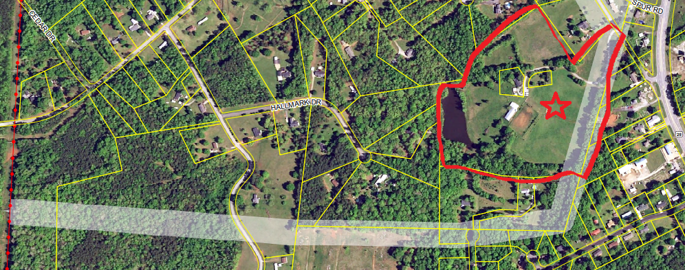 Red line shows the only possible place for the driveway. The drive is double wide and asphalt so they’d have to put in the same, but I’m not even sure there is a way to do that with the direction the drive takes without re routing the entire 1/4 mile long drive or taking out the tiny strand of trees, the horses only natural weather break in that pasture.