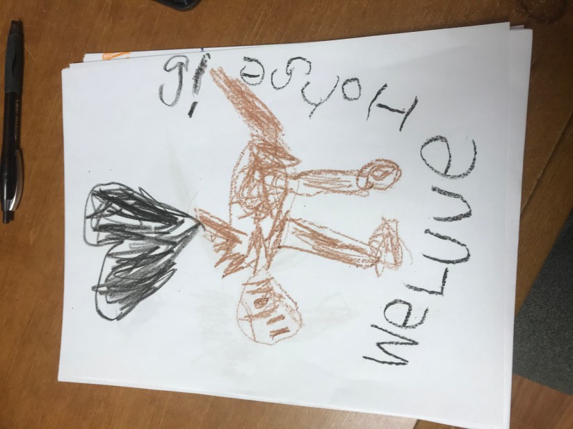 Wyatt had to be picked up early at school the day after his birthday. He tried to make it up to me by drawing me pictures. It might have worked.