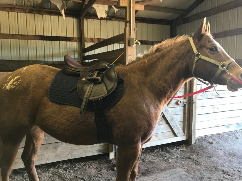 H’Appy was being a puppy on a string through the entire tacking process. He never pawed, ate the cross ties or tried to eat me. It was his best behavior to date and I felt good enough about him to forgo lunge work before mounting.