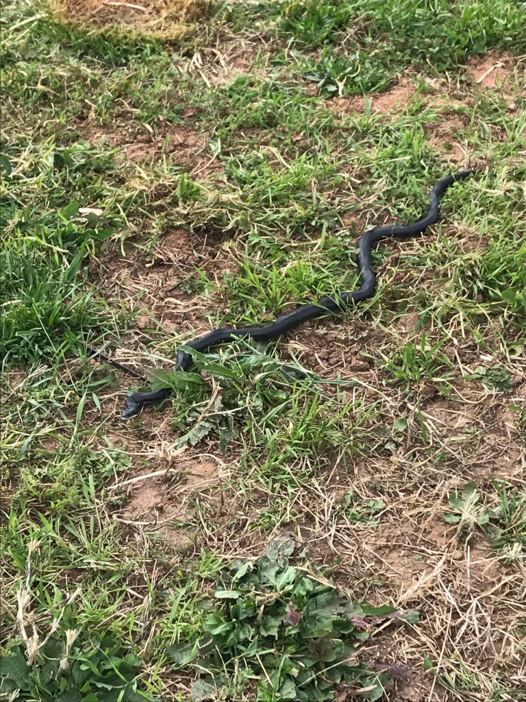 Saw this lovely snake while bush hogging the back pasture. I was so glad I didn’t run him over. A Red Tail Hawk was circling over head and I probably sounded insane when I screamed “If You even think about eating my snake I’ll kill you!”