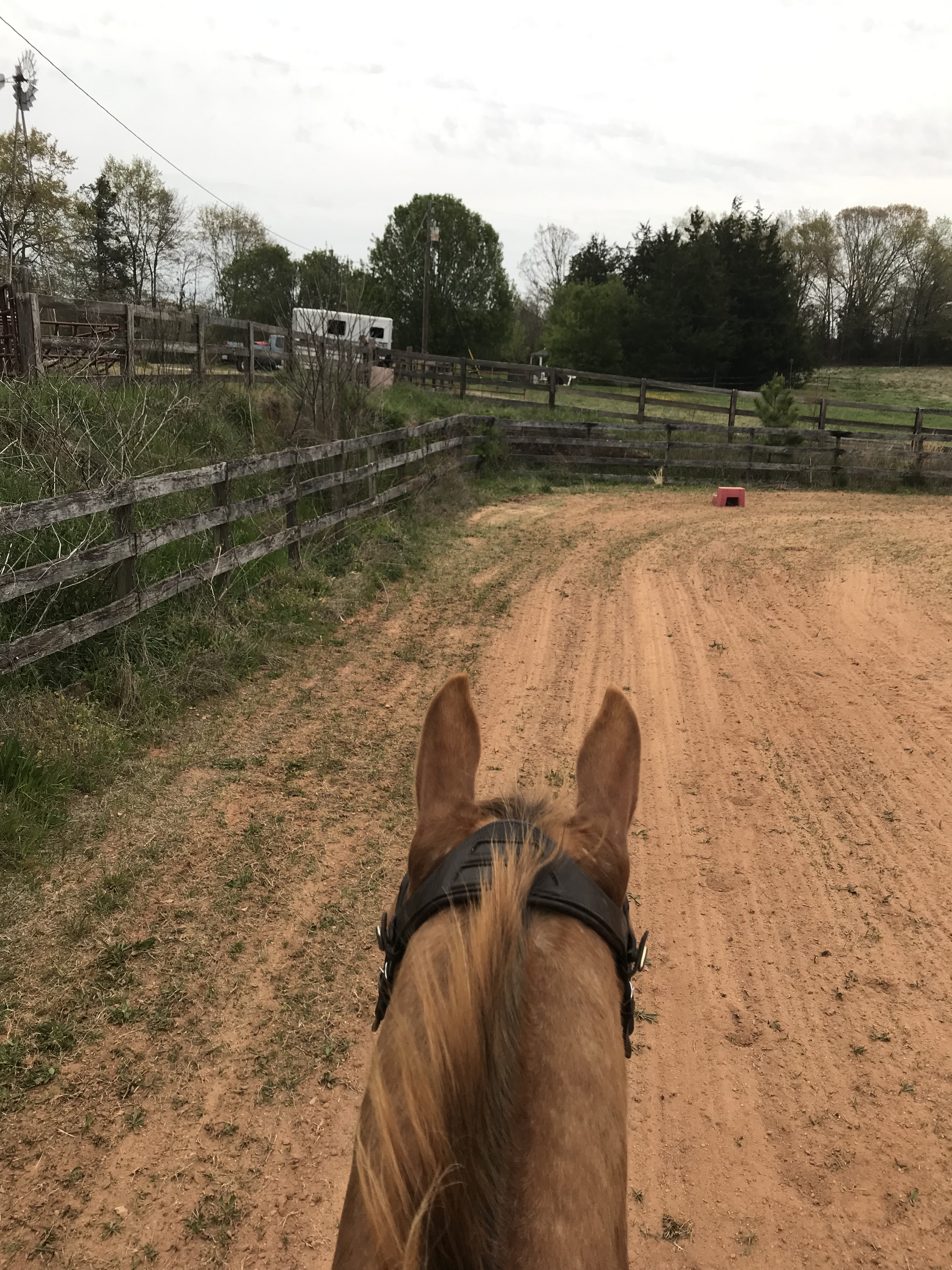 Once I felt his attention wander off to more exciting things than me, I began work on transitions. Lots and lots of walk, halt and trot transitions all over the place with a few random 20 m circles thrown in for funsies.