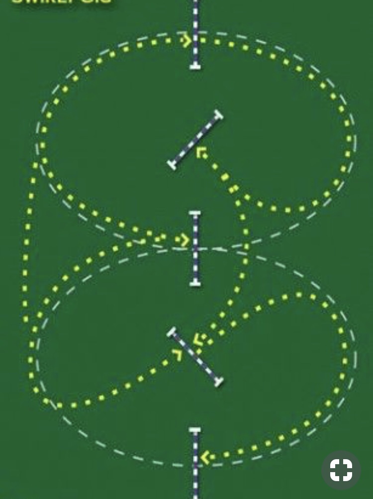 After he performed the serpentine I began work on using the near two straight poles to create a circle and then head to the far two straight poles to circle down there. That then turned into a large figure 8.