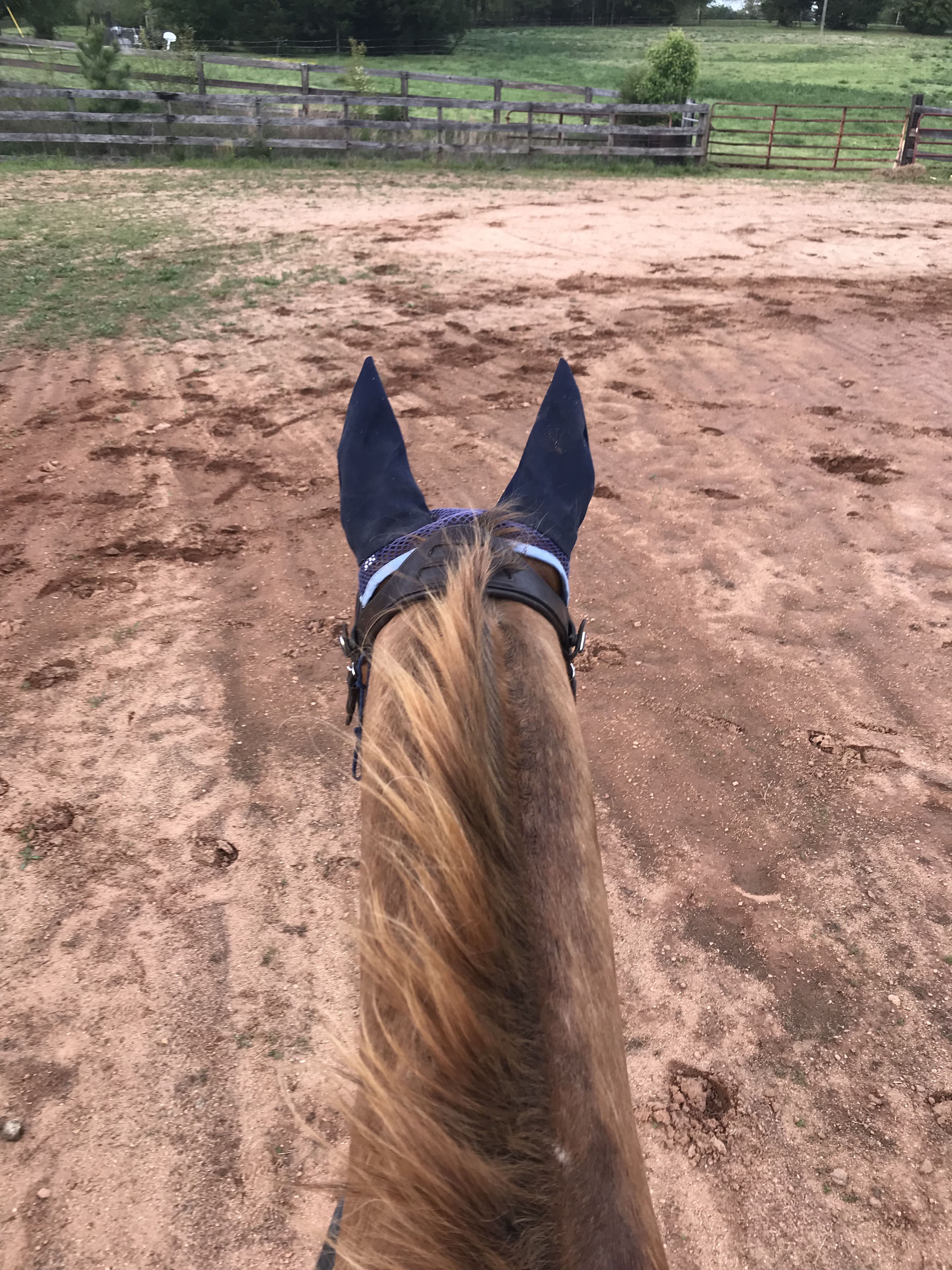 Once he did that entire exercise calmly and with an even pace (with properly timed half halts and leg from me where I knew he’d either speed up, heading to the gate, or slow down, heading away, which I got better at as we went along) I walked him out of the arena to cool down in the pasture. It’s a new habit I’m trying to do at the end of every ride to get him used to riding out there.