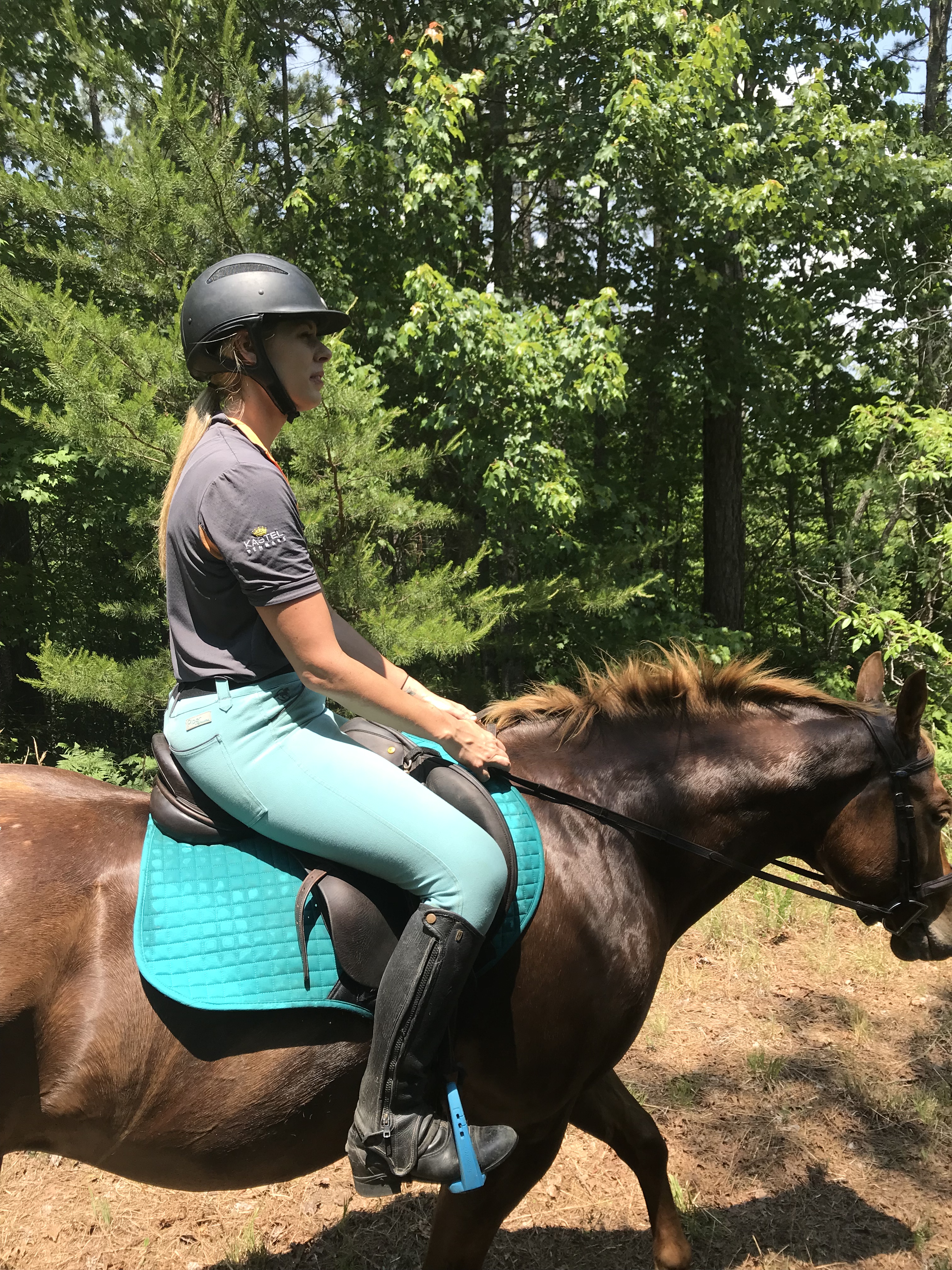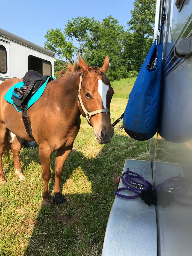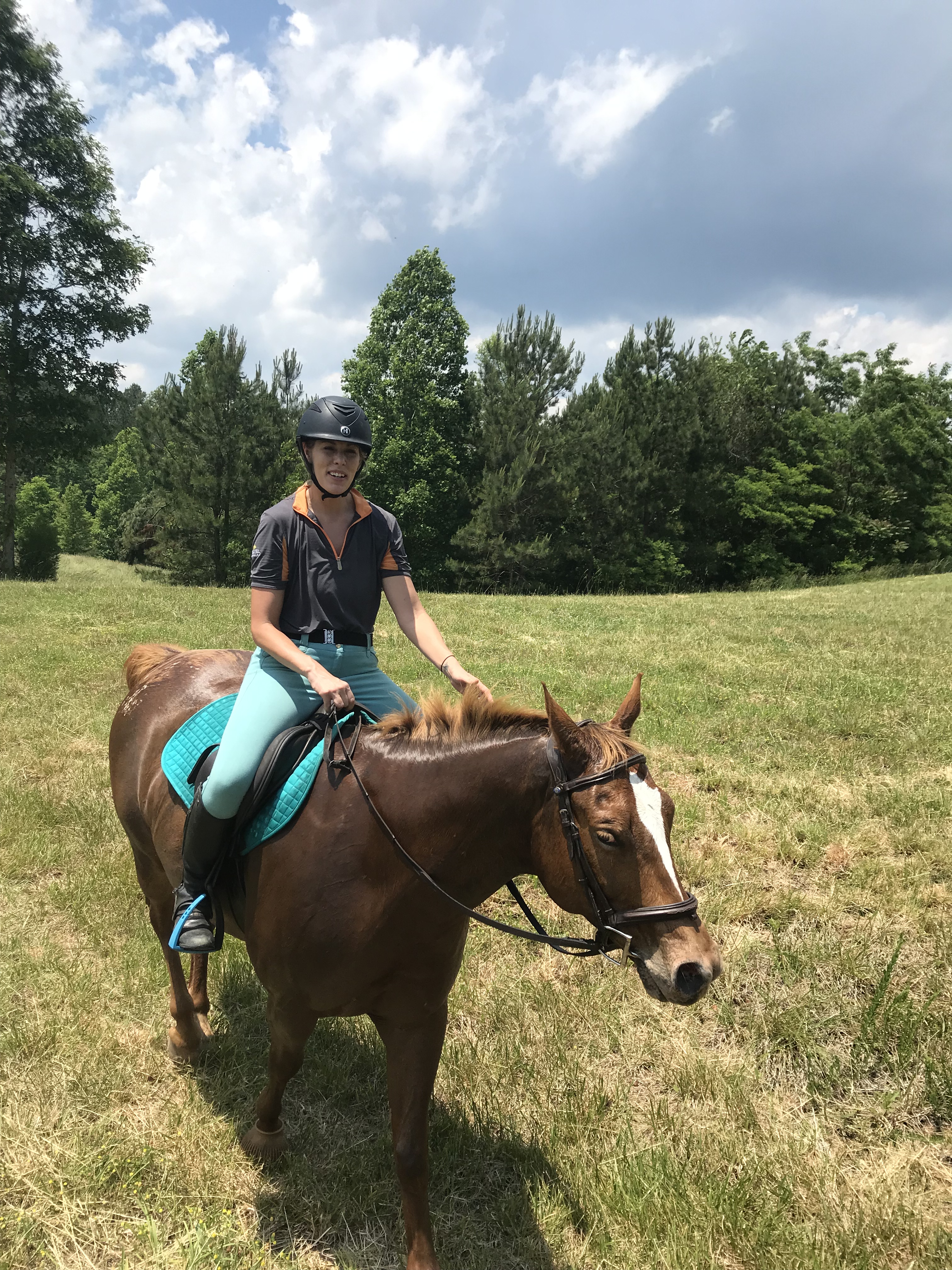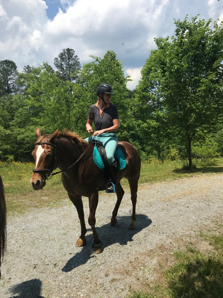 Continuing along in the flat work, Trainer AB wanted me to stop focusing on perfection which ended up being another major breakthrough. When I would ask for a down transition, say from canter to trot, I would immediately get after him for a great trot which is how I was taught in the past. She wasn’t too thrilled with this and said that I need to break it down for him more. He isn’t a baby, but he also isn’t a highly trained professional either so we need to cut him a little slack. When I would ask for the trot, she didn’t care what trot I got as long as it happened when I said. After a few strides, I was then to package him up. So it would look like this: canter-ask for trot-get a flopping limb flailing trot-praise the down transition-3 strides later package him into a good quality trot-ask for walk-get a floppy walk-praise the down transition-3 strides later get a good quality walk-loose rein. I know in the future we will need to get higher quality right away but not where we are at right now. I’m not sure if this had that big of an impact on Eeyore, but it sure took a lot of the stress off me to have that perfection taken off the table. By the time we finished the flat work and moved on to ground poles, he was really relaxed, calm and listening.