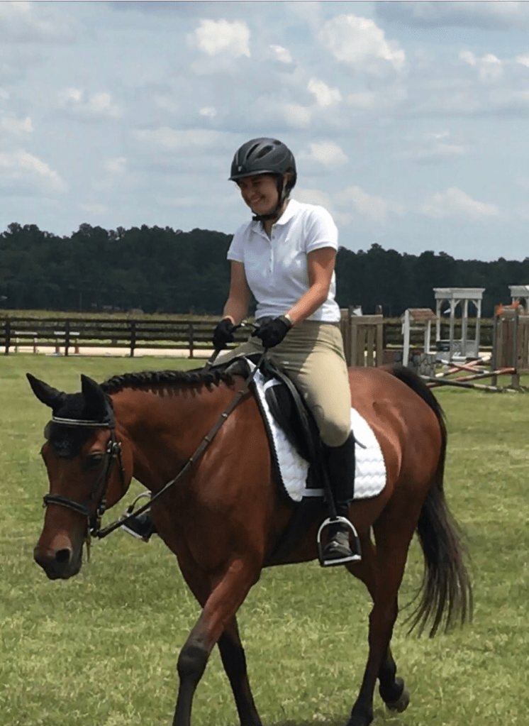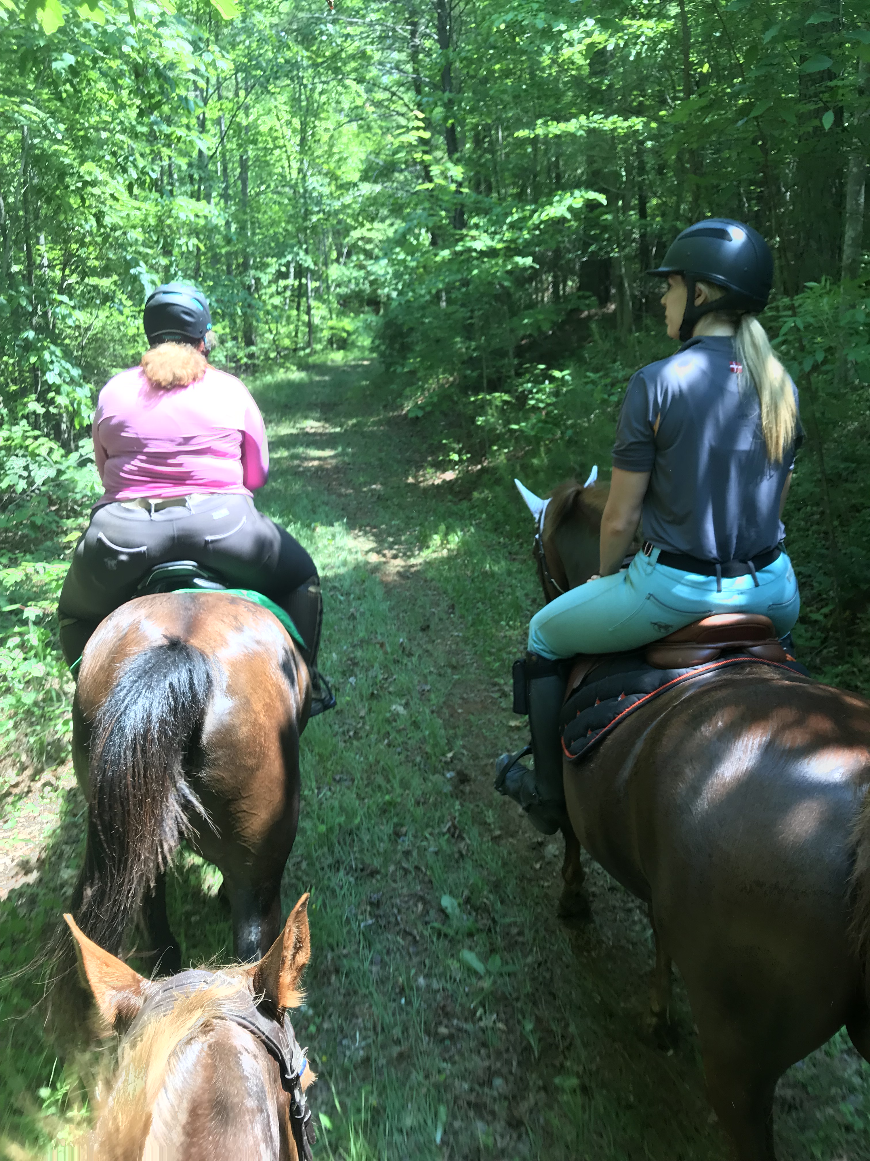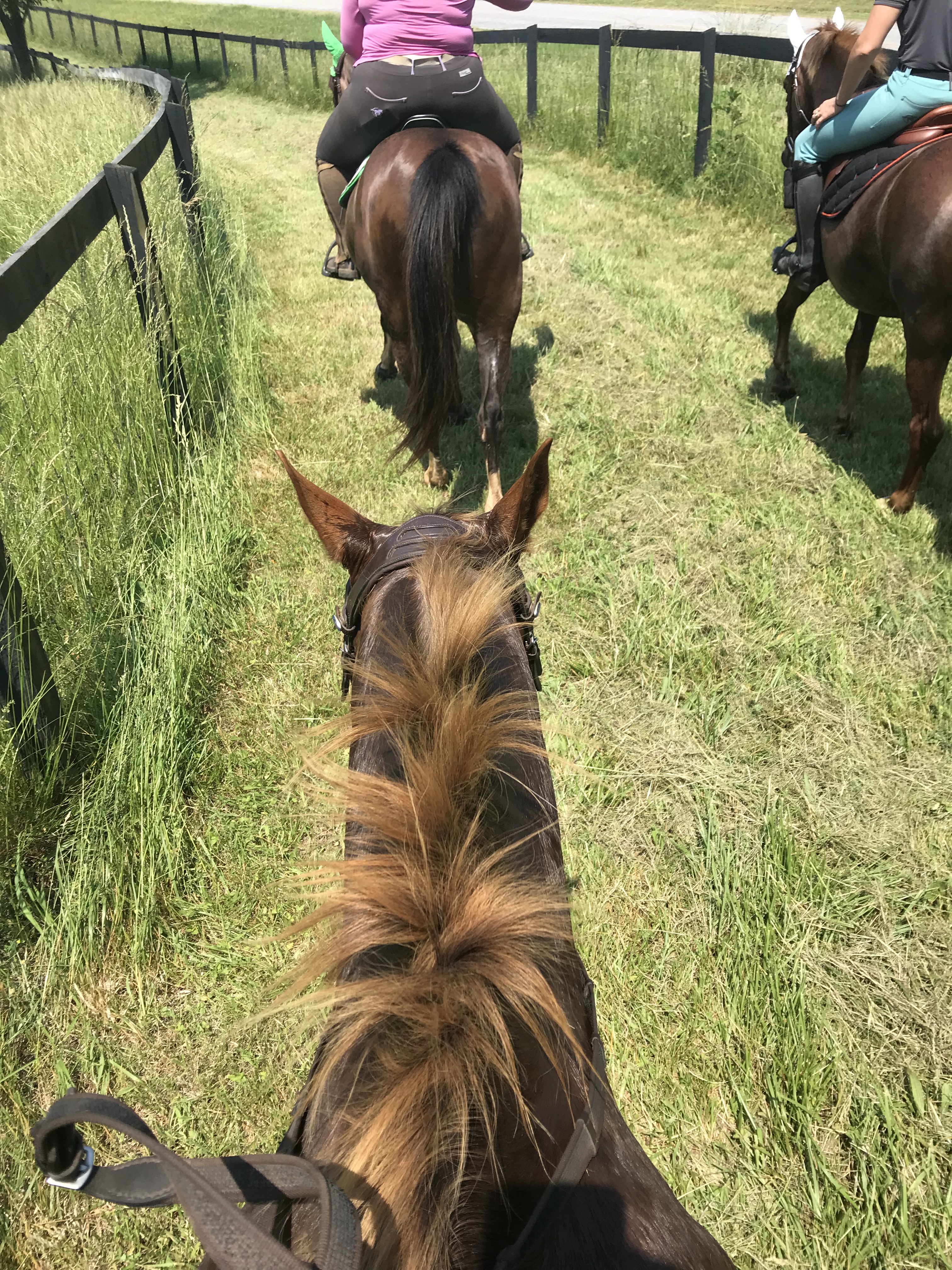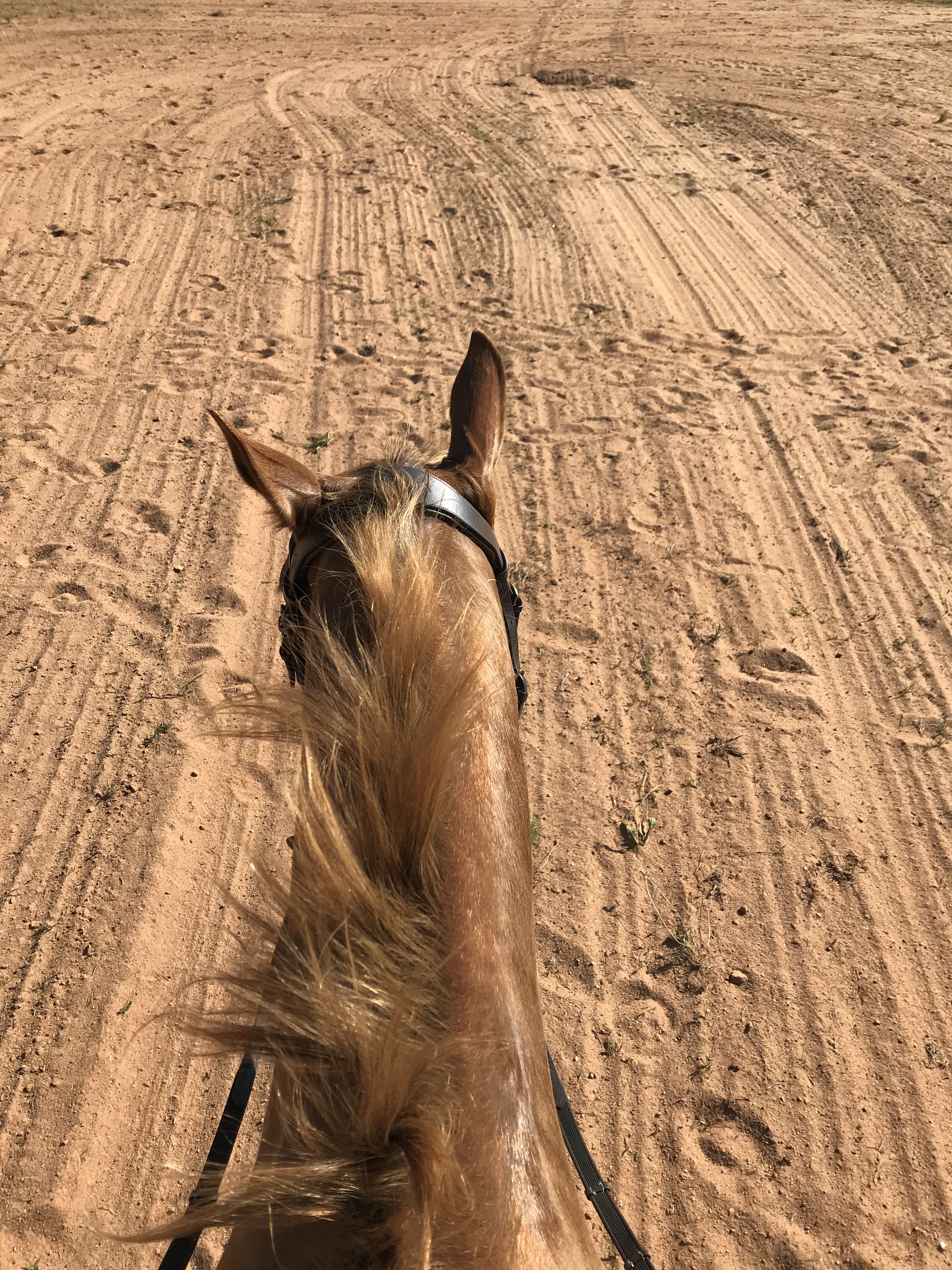 Continuing along in the flat work, Trainer AB wanted me to stop focusing on perfection which ended up being another major breakthrough. When I would ask for a down transition, say from canter to trot, I would immediately get after him for a great trot which is how I was taught in the past. She wasn’t too thrilled with this and said that I need to break it down for him more. He isn’t a baby, but he also isn’t a highly trained professional either so we need to cut him a little slack. When I would ask for the trot, she didn’t care what trot I got as long as it happened when I said. After a few strides, I was then to package him up. So it would look like this: canter-ask for trot-get a flopping limb flailing trot-praise the down transition-3 strides later package him into a good quality trot-ask for walk-get a floppy walk-praise the down transition-3 strides later get a good quality walk-loose rein. I know in the future we will need to get higher quality right away but not where we are at right now. I’m not sure if this had that big of an impact on Eeyore, but it sure took a lot of the stress off me to have that perfection taken off the table. By the time we finished the flat work and moved on to ground poles, he was really relaxed, calm and listening.
