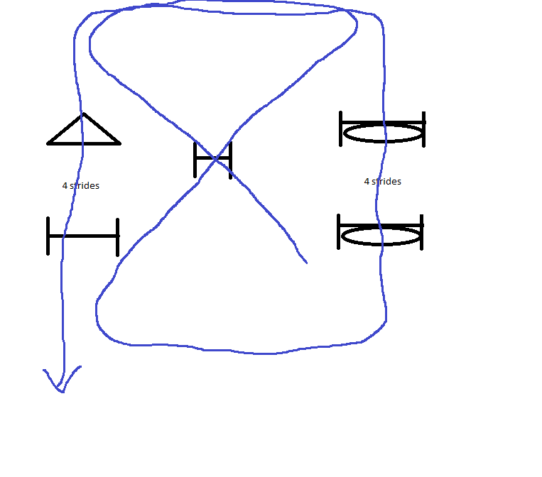 With that in mind I searched online for an exercise I thought was doable, fun, and would also address the other big issue of him taking off after the jump. I knew I didn’t want single fences. I’m also not super comfortable at setting up combinations since I’m not quite sure what distances to set and I don’t want to punish him by setting up something wonky.