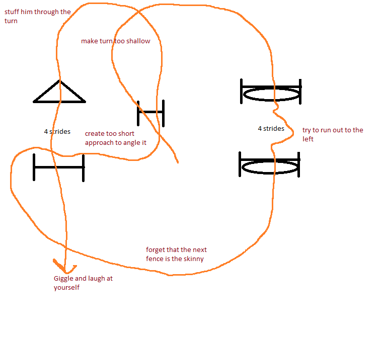 We started over, re-approached fence 1, I rode backwards to it planning for another refusal and got left behind, made the turn and took 2 and 3 in four strides. Then…..