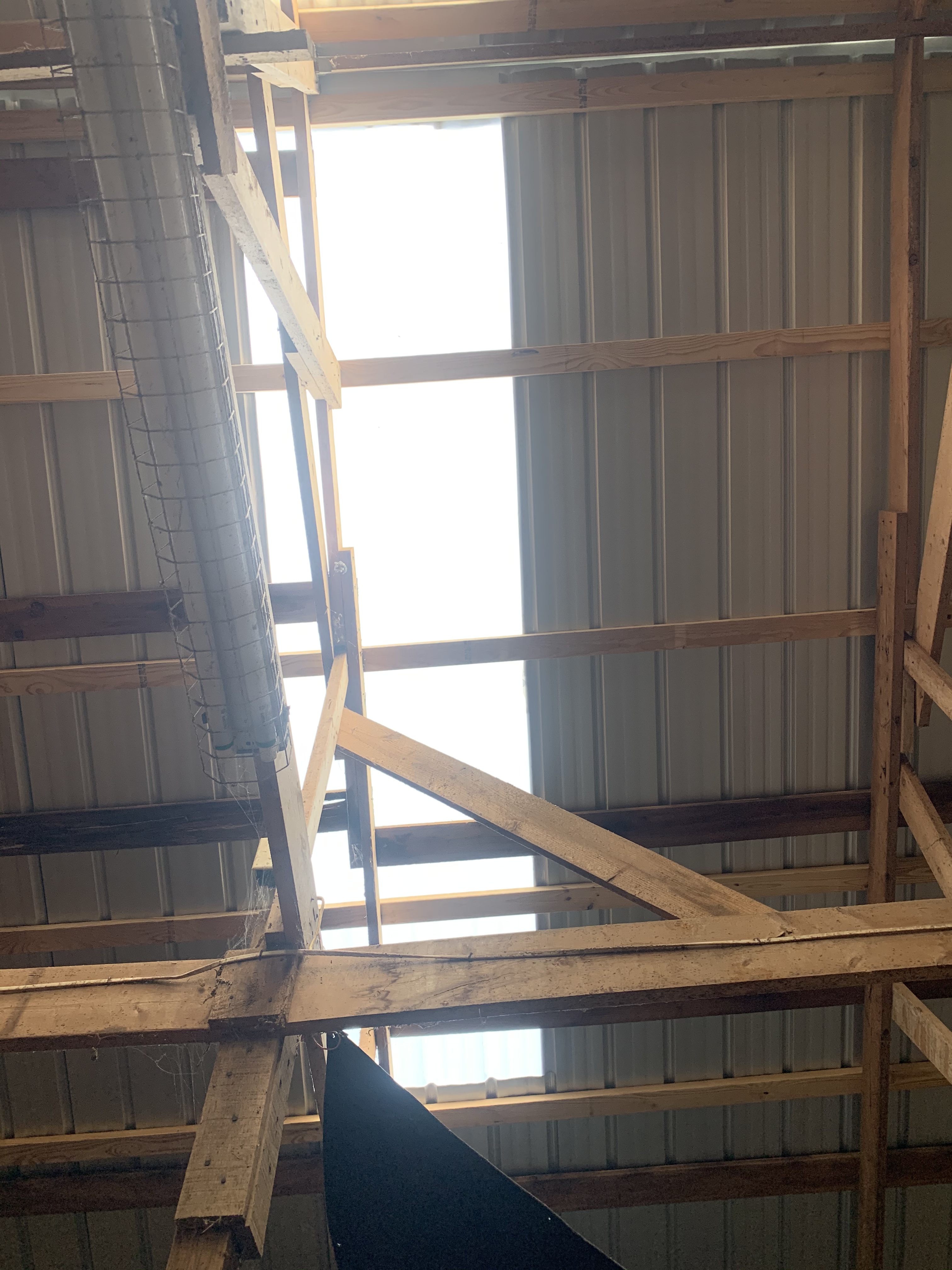 He pointed to the judge’s booth attached to the arena side of the barn. We had not wanted this done because it didn’t leak and wasn’t necessary and we had told the guy we hired not to include it. Apparently that didn’t get communicated to the sub contractor because he had done it.