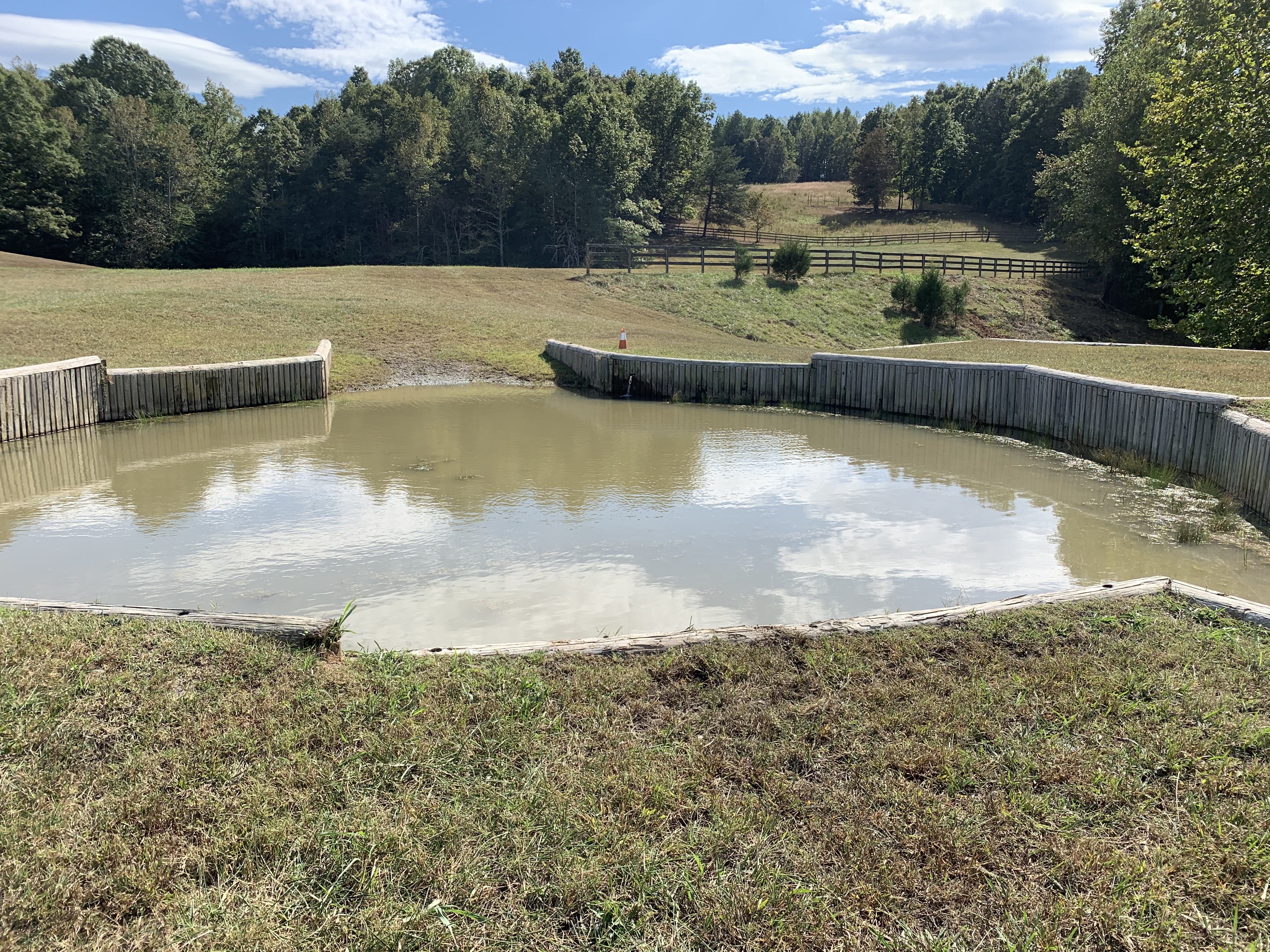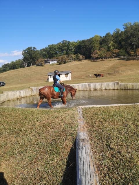 From there we had two more simple exercises to go. One was simply walking up and then down the huge, steep mound which he did without issue and the other was the water complex. We walked through first then trotted and then I got to canter through my first water complex!!!!!! It was so much fun.