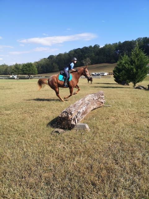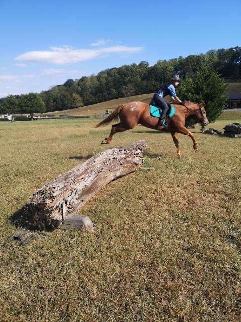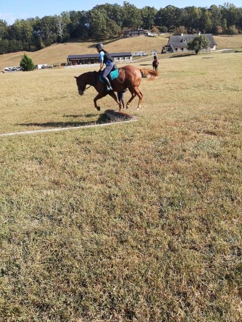 Still though, we did a line of three logs set at 4 strides which was a lot of fun. The first log was doubled and it caught him off guard a bit causing a stop the first time. After that he was game on though and tackled it with gusto. The line was a bit hairy because…well running away and all…but we did it each time both uphill and downhill and got a nod of approval from Trainer AB with a “well, sure you were getting run away with but you stayed the course and did each jump so it was good!”