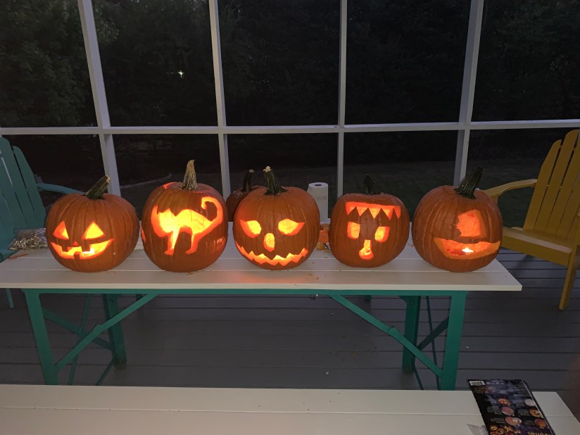 The reason I didn’t get a ride in Tuesday to prep for Wednesday. Mine is far right. it was supposed to be a witches hat but um…looks more like a pilgrim hat or a really bad cyclops. M is far left, Wyatt the cat, my mom the face, my dad Frankenstein’s face.