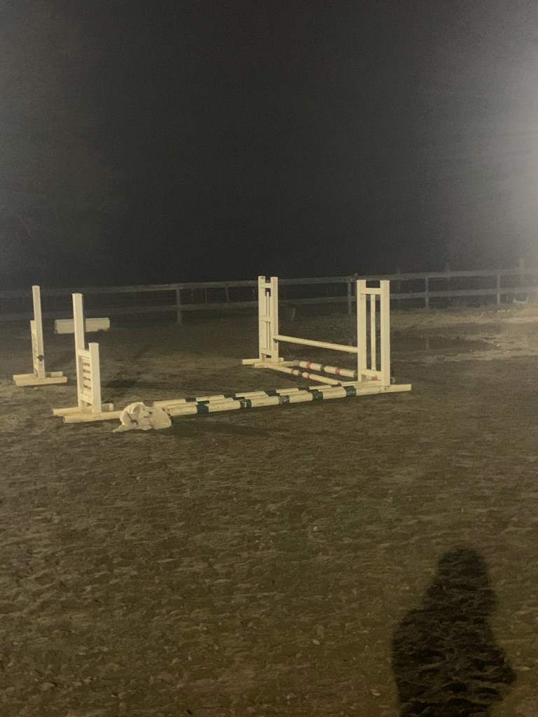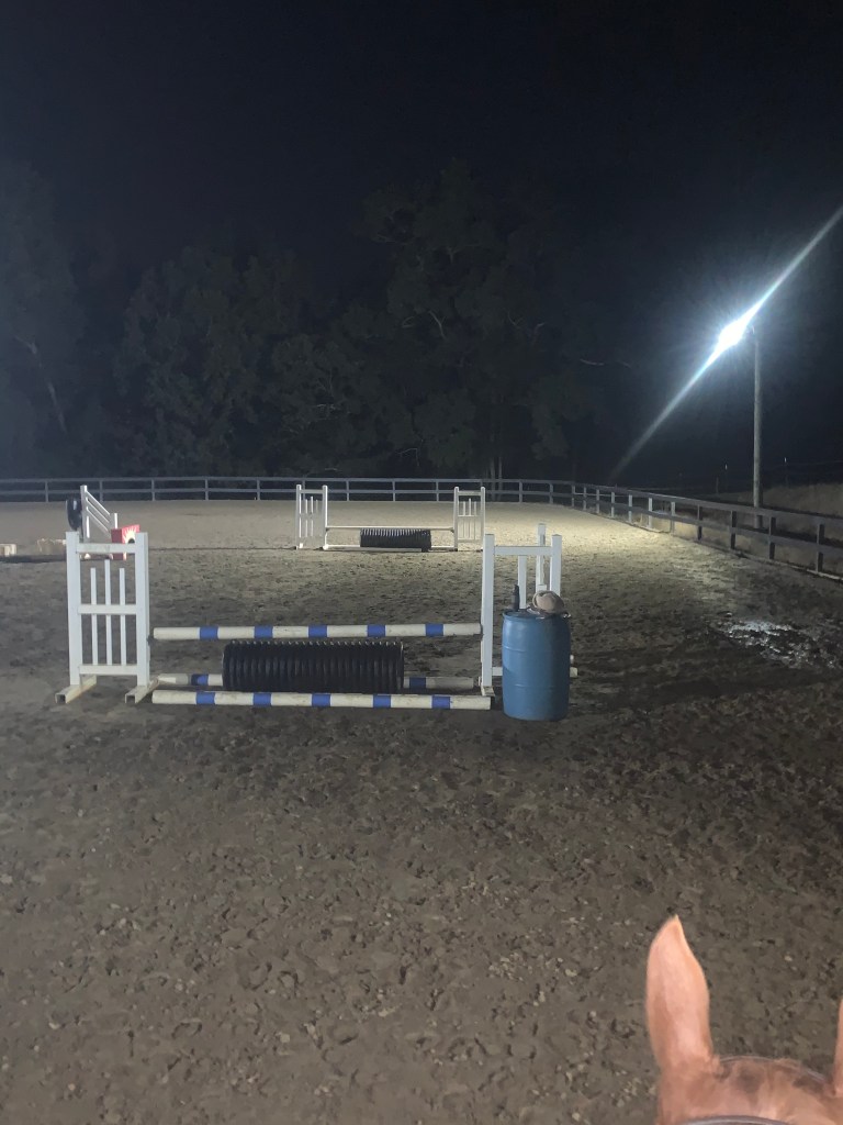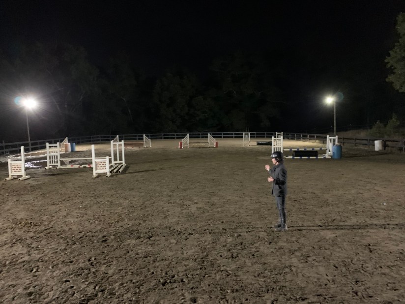 I casually mentioned to her that I have never done a fence on a n angle before and approached. The previous horse had peed a small lake right in front of this jump and Eeyore had eyes only for that. He slammed to a stop. Now in the past I’d get all scared about this and let him back off. Not last night. I made him face that jump and take it from a stand still. He was not getting the option to say no. So we did and took out the entire jump on the way through it. But again Trainer was full of praise that I made the decision I did and got the job done.