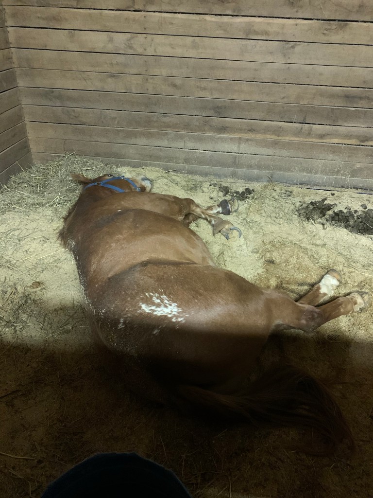We got home at 4:15pm and I put Eeyore back in the pasture as I always do. Nothing out of the ordinary happened to be a red flag during the school or ride home. Trust me, I’ve about killed myself wracking my brain over what I did wrong. I was starving having not eaten all day so we ran to the local Waffle House for a cheap and quick dinner. When we came home 45 minutes later Eeyore was laying down in the pasture.
