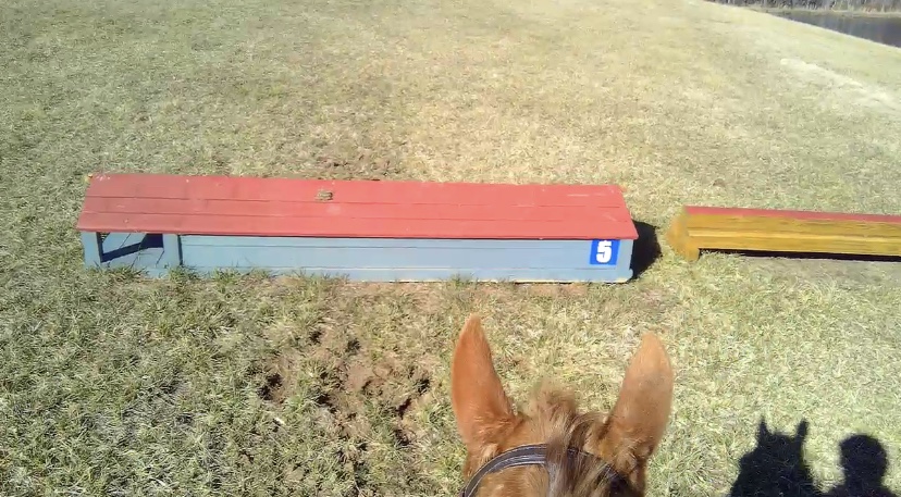 We did a BN coop, turn right through the water, left over a BN cabin, then up the hill to a starter ramp/step thing between the cedar trees out of sight. Our first attempt we botched pretty good, but made it over all three eventually. I was so focused on getting over that massive looking coop, that I forgot to ride the back side and had to make a left hand circle to go through the water, nearly biffed the turn to the cabin, and then he refused the ramp because I was pulling on him too much but we represented and he went right over and that refusal was my fault.
