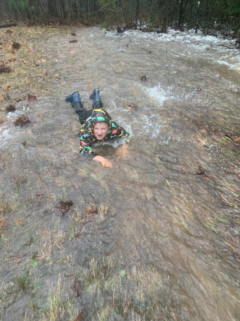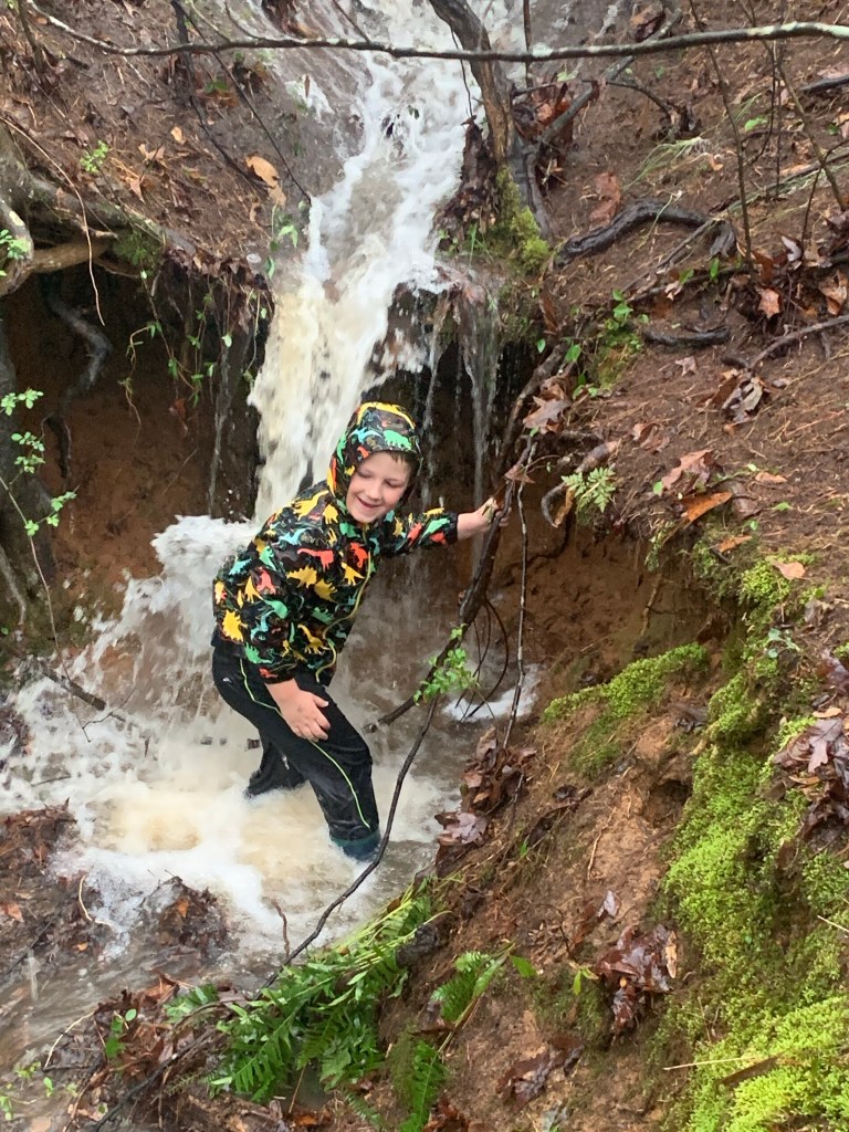 Wyatt thoroughly enjoyed all the new waterfalls and creeks the flood created on our property