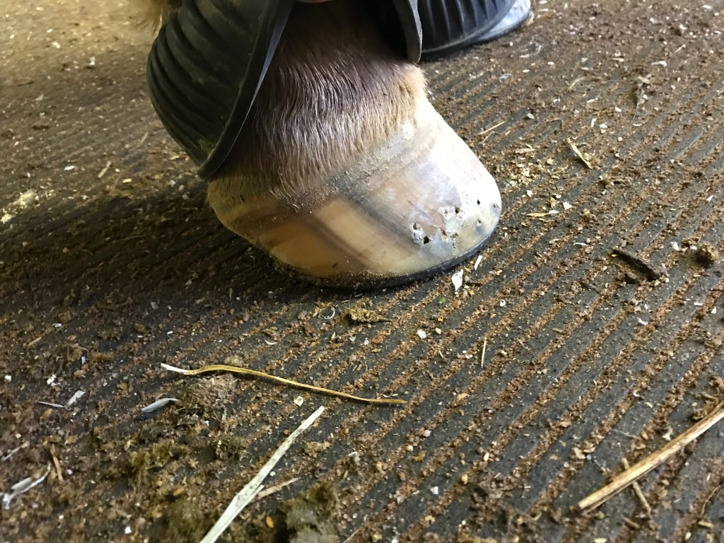 The right front is the high hoof in his high/low syndrome feet. It’s about a trim behind the left in regards to health and growth rate from his awful state last summer
