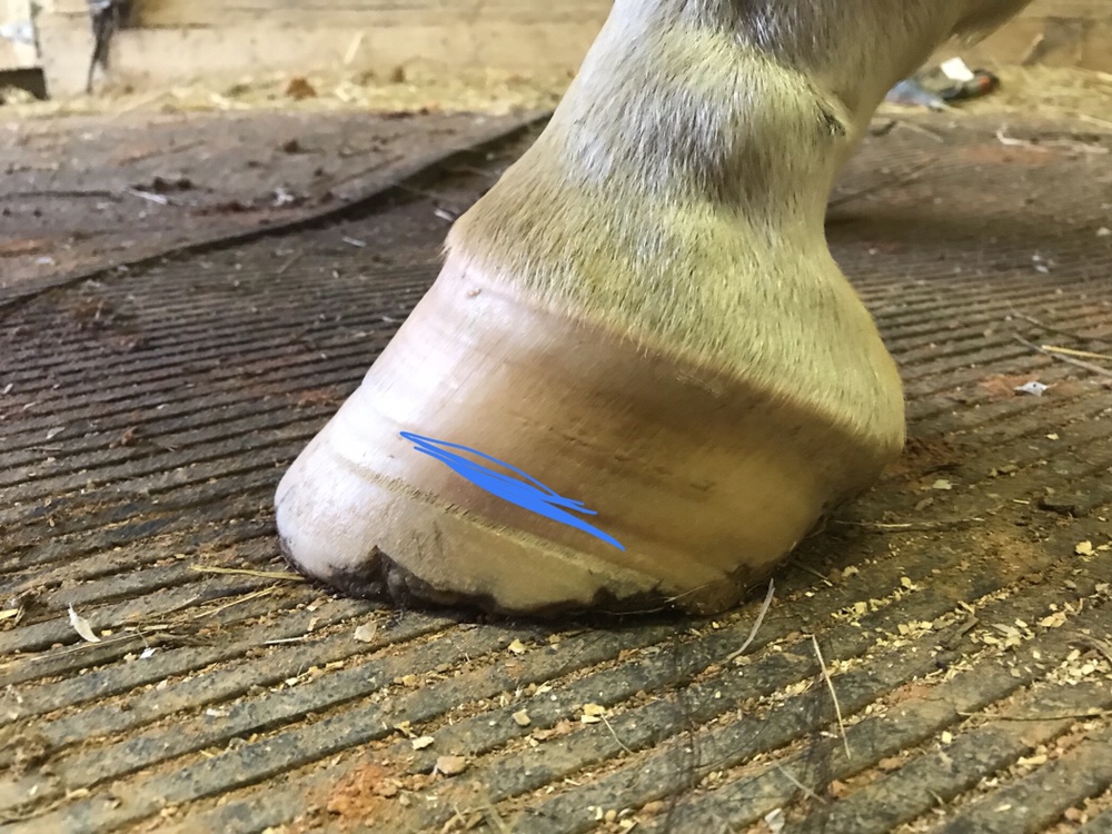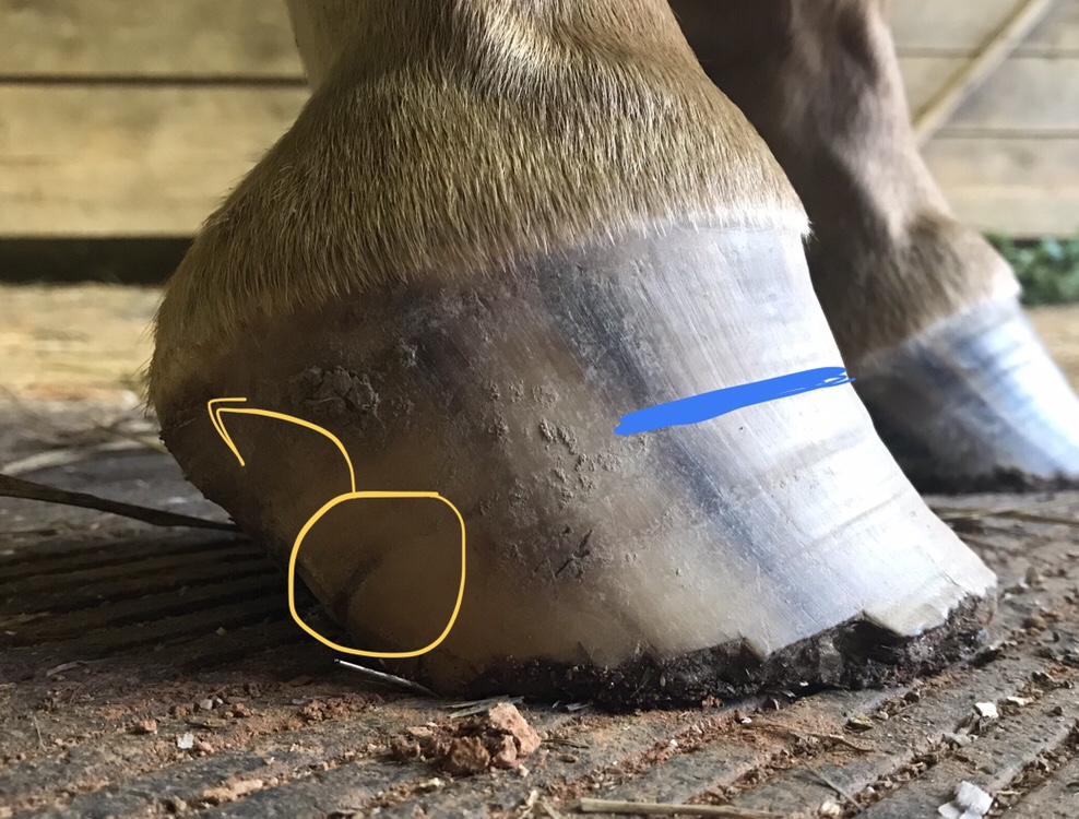 The yellow shows an abscess he formed six weeks ago and the arrow points to where it began. This is also useful to me to see how much the hoof is growing. And it is growing. Quite quickly and nicely. The issue is all that chipping that even keratex isn’t preventing and that makes it impossible to safely shoe.
