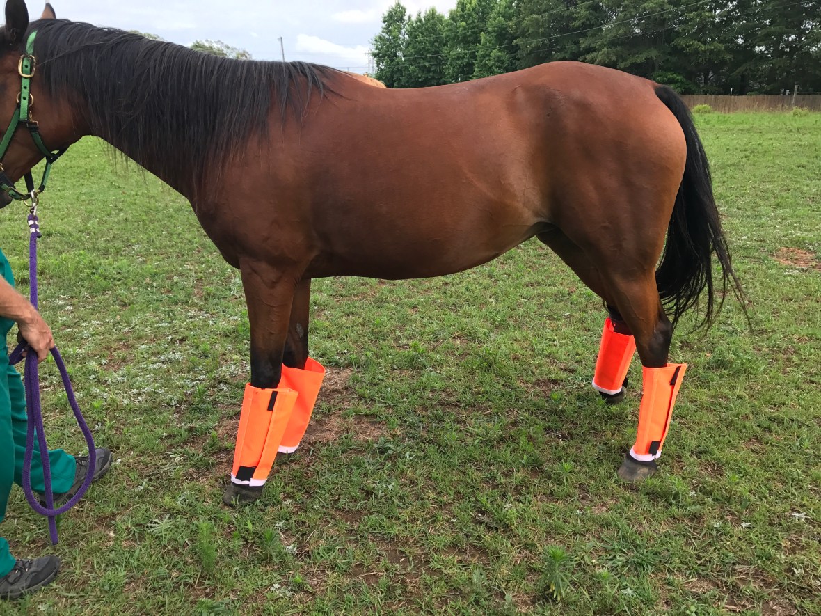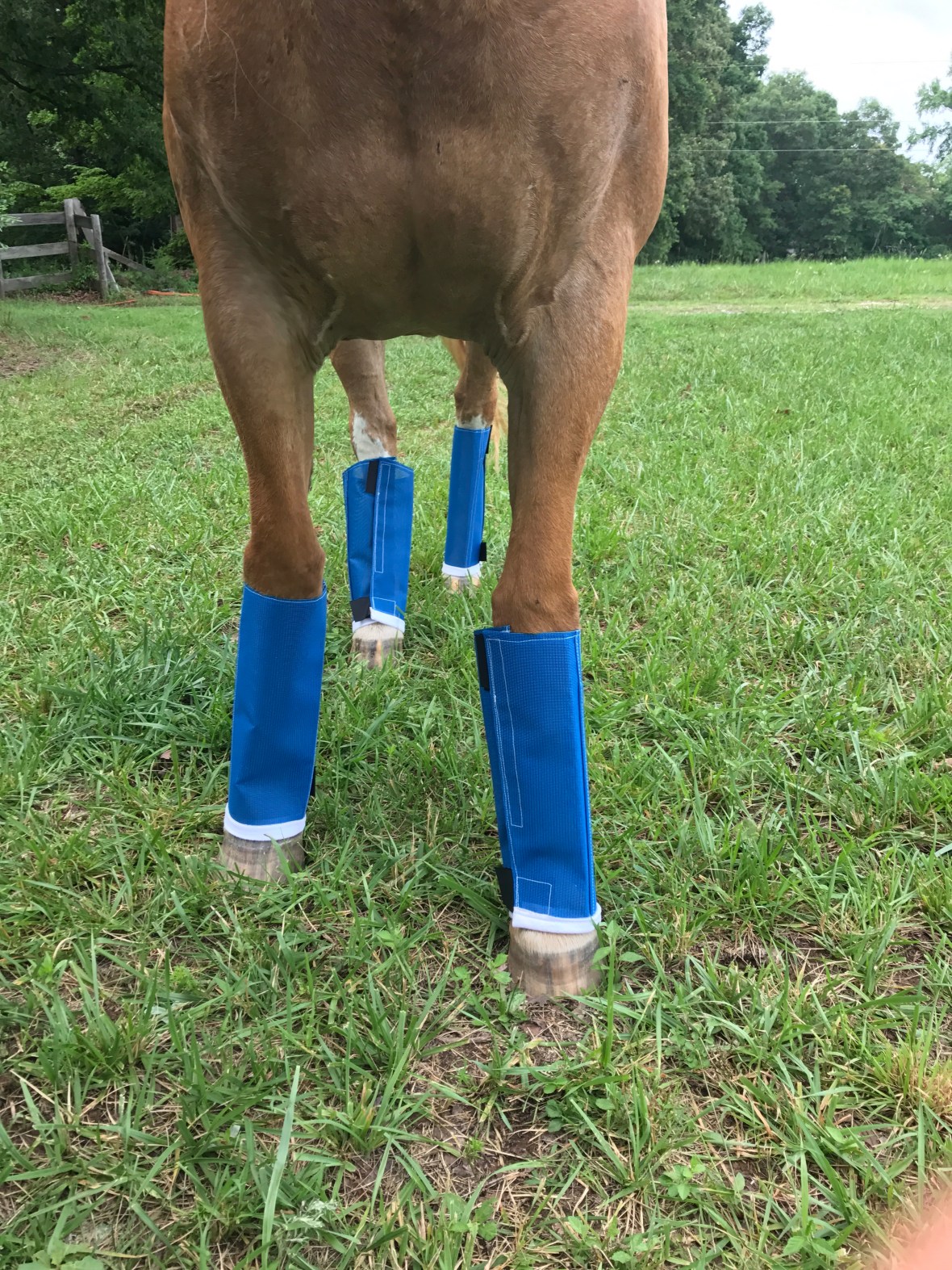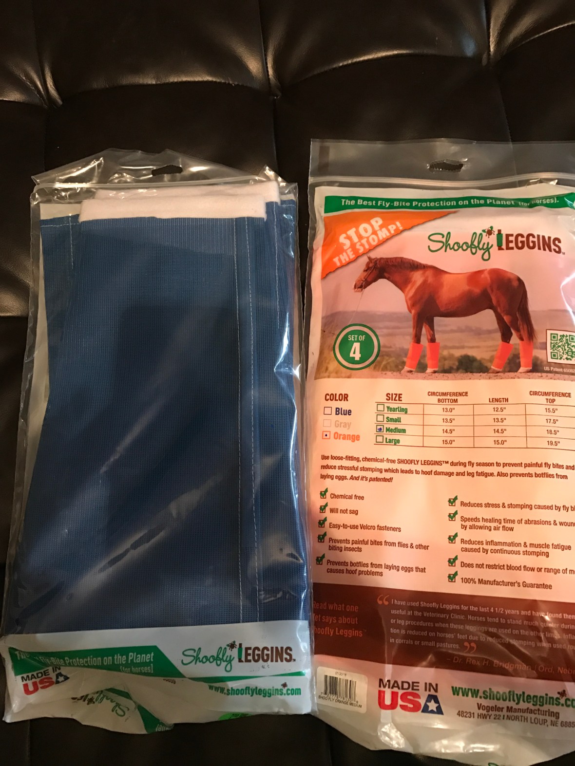 My first thought was to purchase fly sheets, but the high heat and humidity around here made me hesitate. I don’t need my horses to get heat stroke. Then I stumbled upon the Shoofly Leggings and noticed a local friend was using them. She had nothing but good things to say, so I bit the bullet and ordered two sets.
