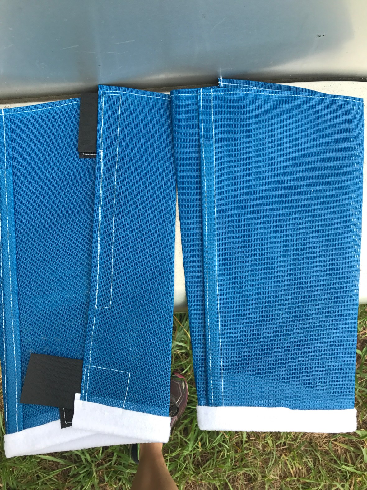 Shoofly Leggings are PVC mesh, loose fitting fly boots. They have Velcro to attach along the entire vertical edge and fleece lining the bottom. They are meant to be open at the top to allow air flow, freedom of movement and prevent rubs. They have no chemicals in them.