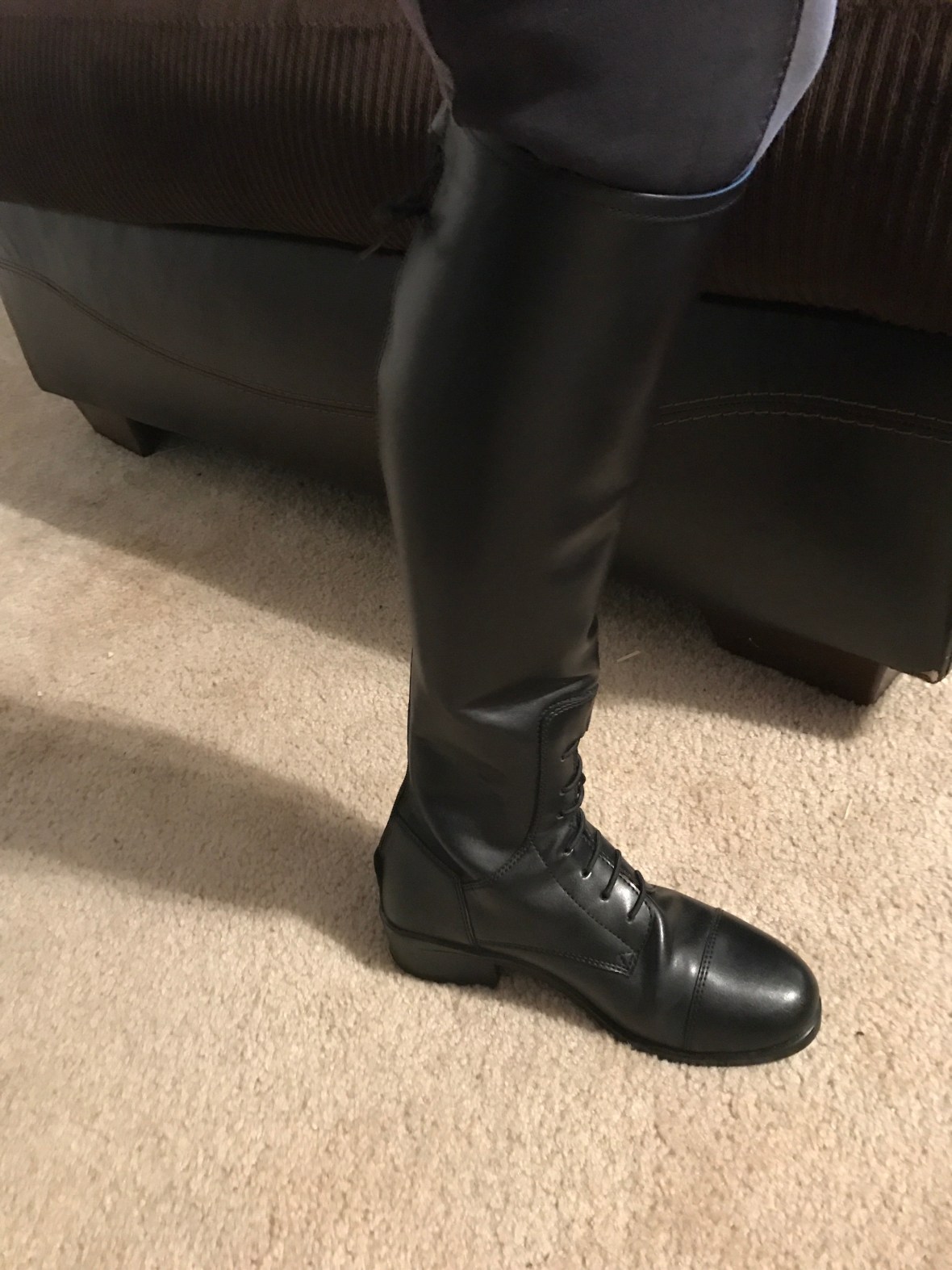 Synthetic tall field boots: I actually really love these. They fit me really well and after two rides and two days wearing them around the house they no longer hurt anywhere. I do find it a bit harder to sink my heel down in them as they are still a bit stiff but I’m getting used to it. $68