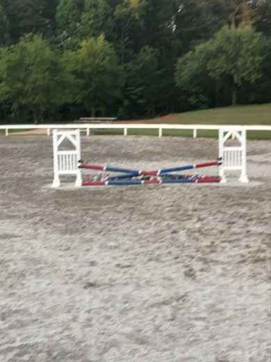 I could have finished on that, but the course from the show was still up and Trainer wanted to work on fences 1-3 since I sucked at those. She made them all 2′ verticals and had me ride them like in the show but add our new cross rail as fence 4.