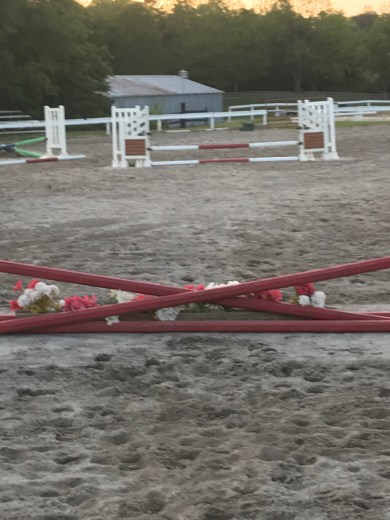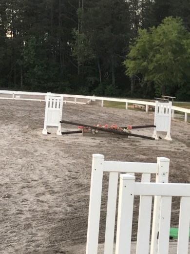 The vertical led right to this Red Cross (so my phone keeps capitalizing it as if I’m talking about the American Red Cross and I am tired of trying to correct it so you get this version) rail with flower filler. It was actually really great because it made me get Gem back to a trot quickly and set back up for the jump.