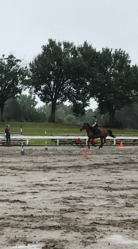 The first game was pole bending and I got to watch the practice run. The girl started trotting but soon got Gem flying at the canter and Gem was game on. She was even doing flying lead changes between the poles! Trainer laughed saying maybe I was persuing the wrong discipline with her.