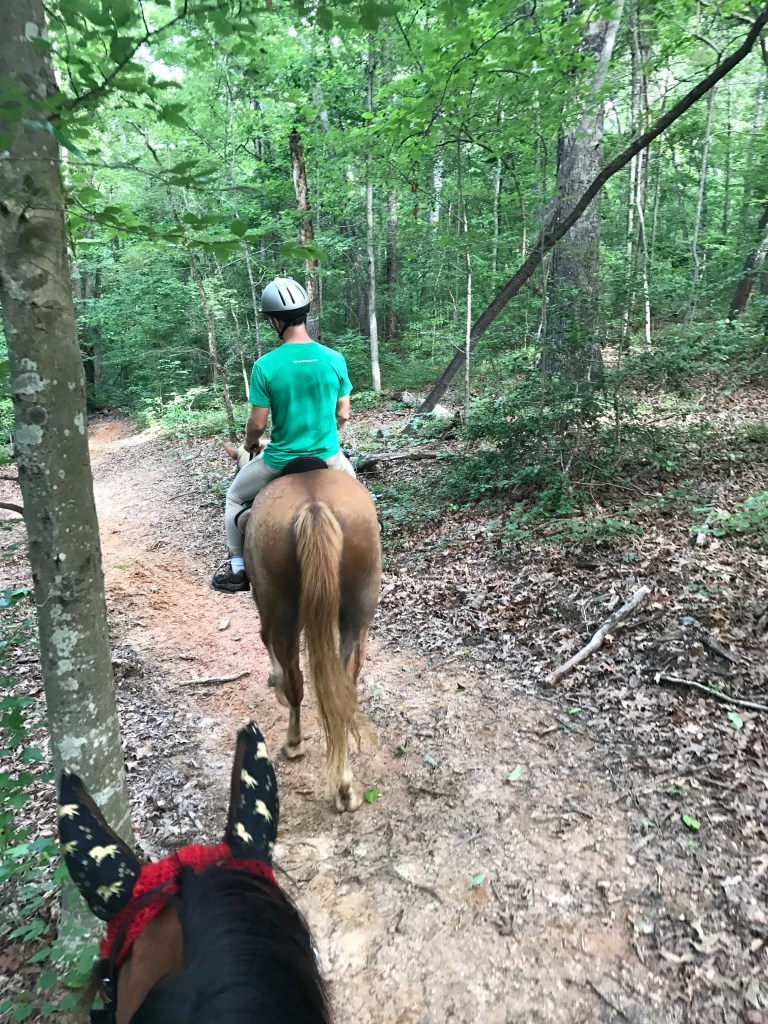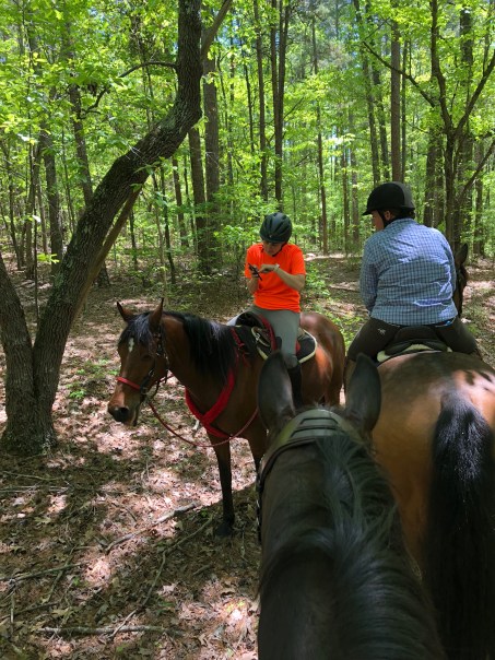 Once we got back into the woods, I started to ask for trot sets. I’d ask her to trot and maintain her pace for a while. During this I really worked on what trainer J had taught me: make sure my thumbs are up, close my fingers and relax my elbows. It is amazing how hard it is to force yourself to relax!